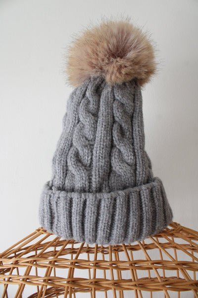 Ugg Gray Cable Knit Faux Fur Pom Pom Beanie