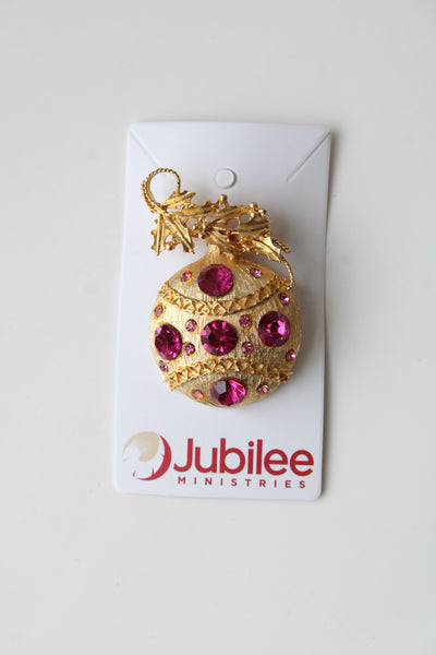 Pink Stone Gold Tone Christmas Tree Ornament Brooch Pin