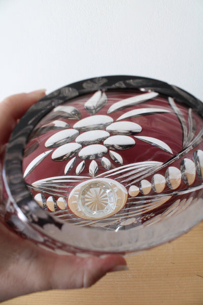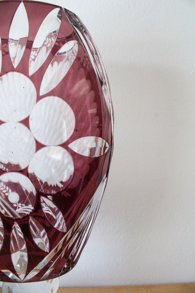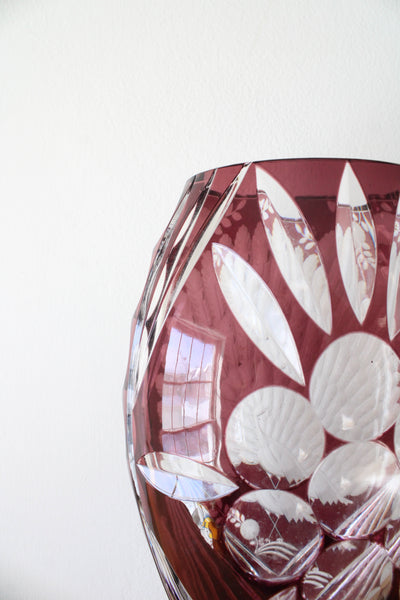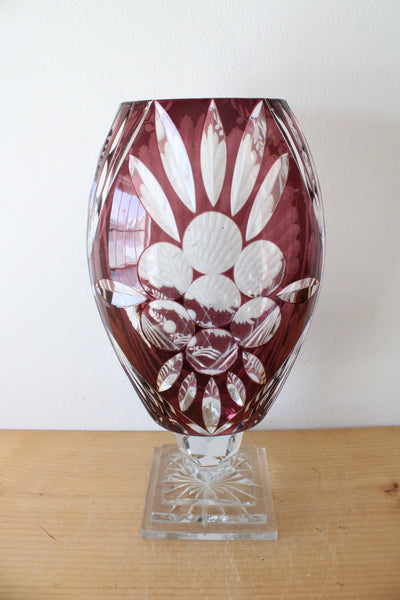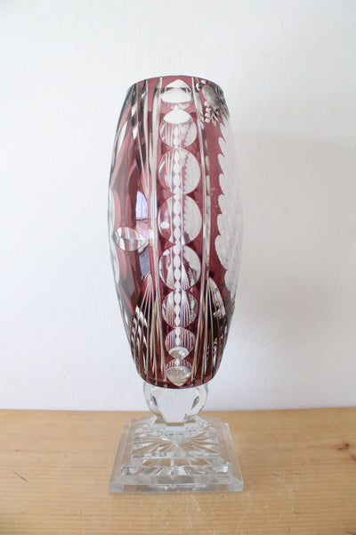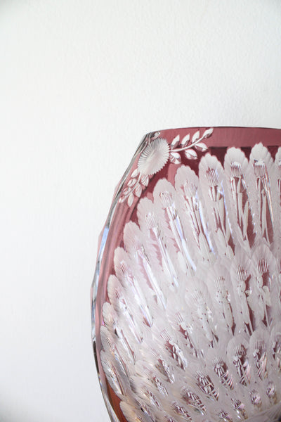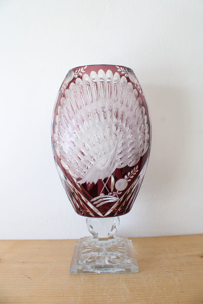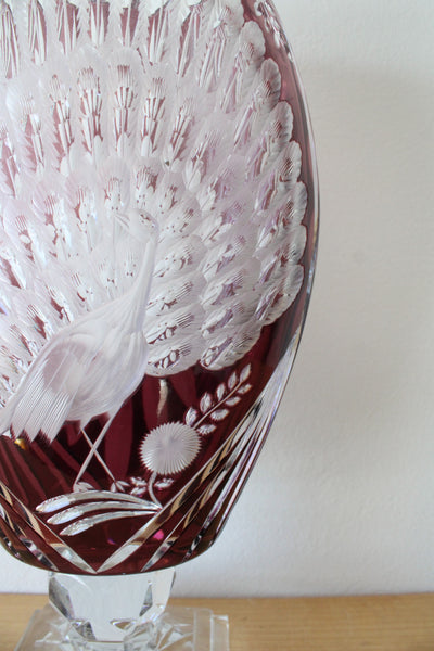 Ruby Red Bohemian Peacock Cut Glass Vase