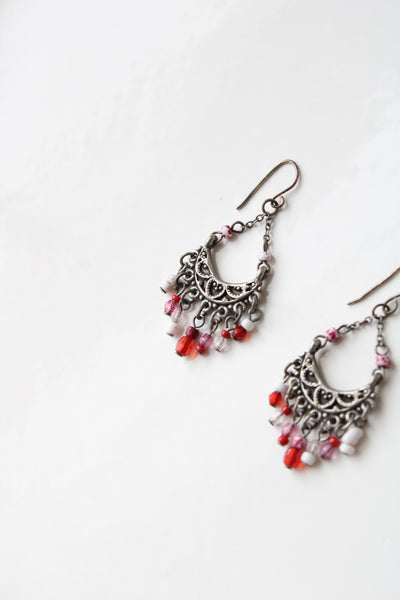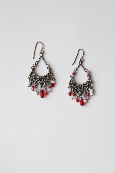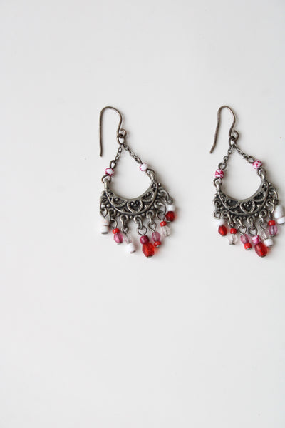 Silver Pink & Red Beaded Tassel Earrings
