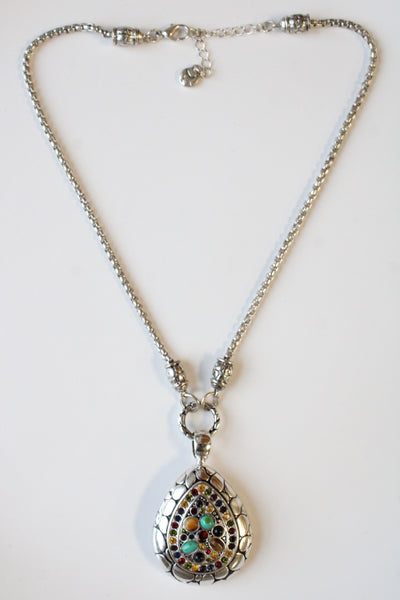 Silver Teardrop Shape Multi-Colored Stone Necklace