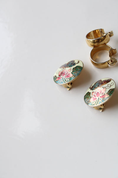Vintage Enamel & Gold Tone Hoop Clip On Earring Set