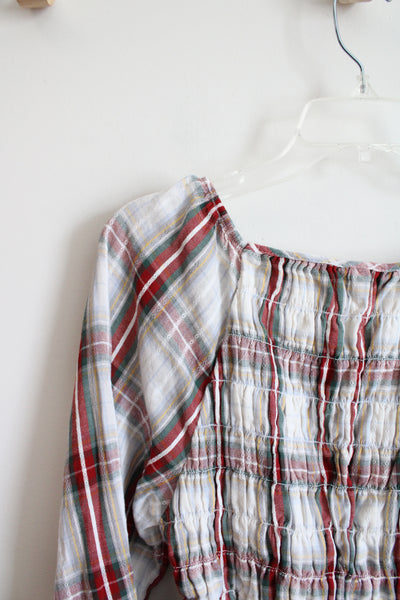 American Eagle Red Green & White Plaid Ruched Cropped Long Sleeved Top | L