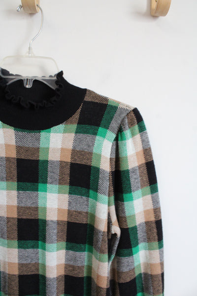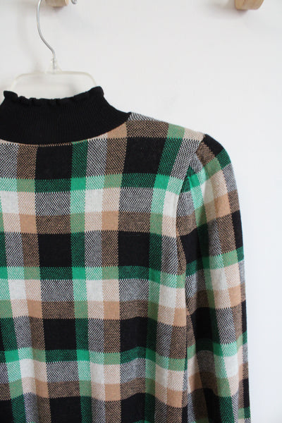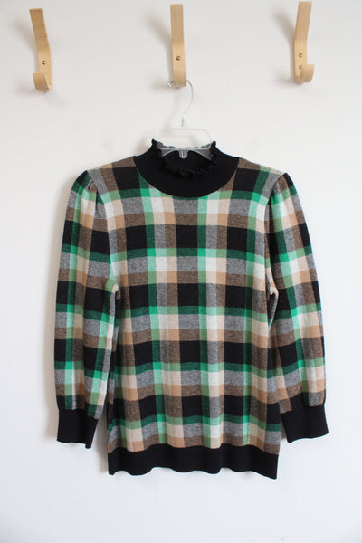 Ann Taylor Black Green & Tan Plaid Ruffled Mock Neck Sweater | M