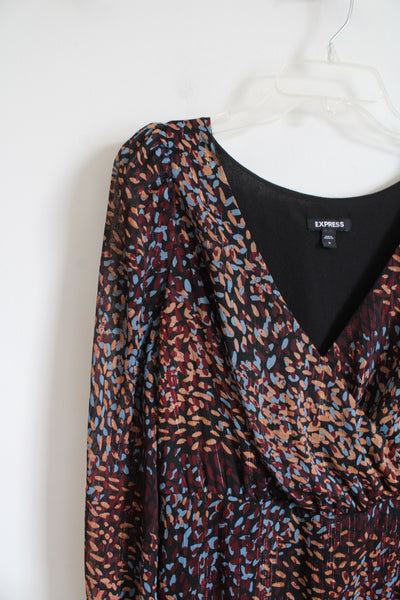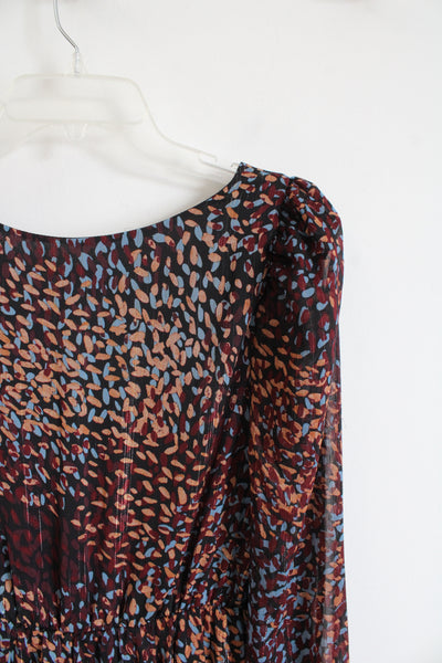 Express Maroon Blue & Tan Metallic Ruffled High/Low Dress | M