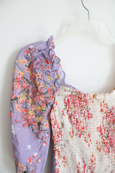 O.Vianca Purple & Cream Floral Ruched Bodycon Dress | L