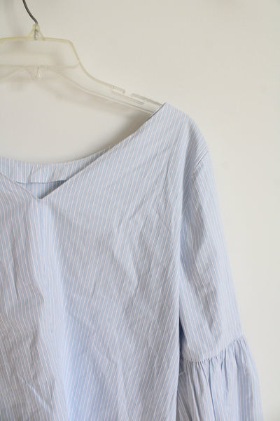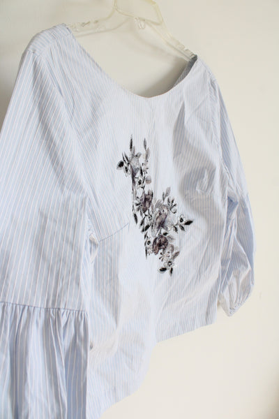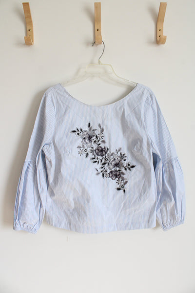 White House Black Market Blue & White Striped Gray Embroidered Floral Top | 10