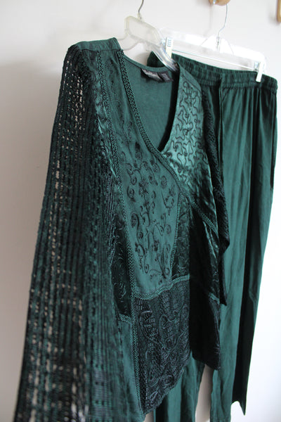 Jewel Queen Vintage Emerald Green Embroidered Sheer Sleeve Top & Pants Set | XL