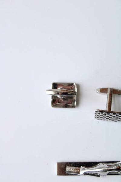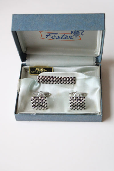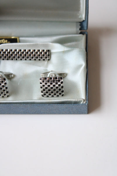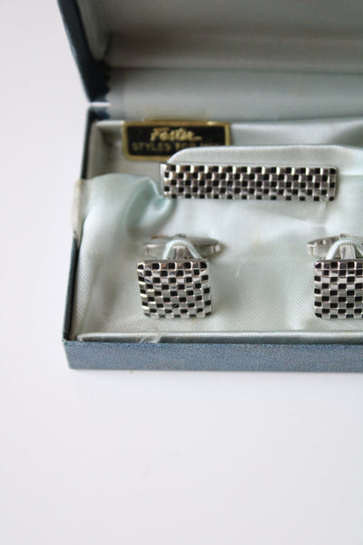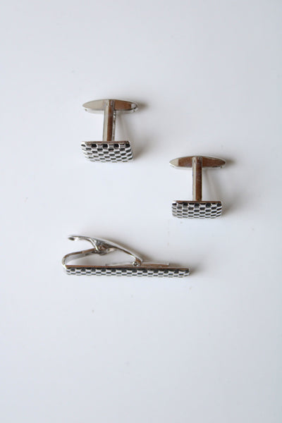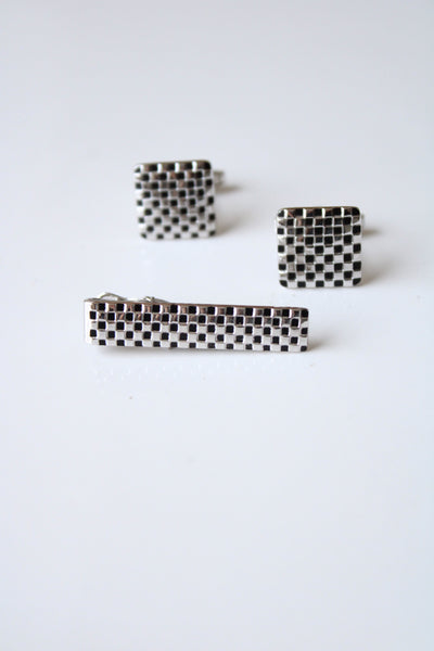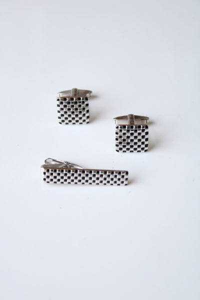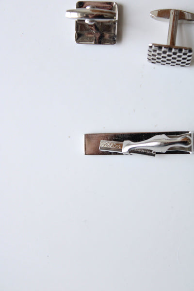 Foster Checkered Silver Cuff Links & Tie Clip