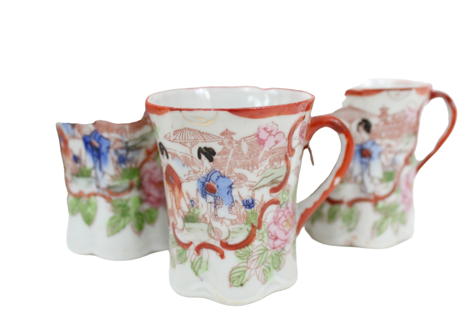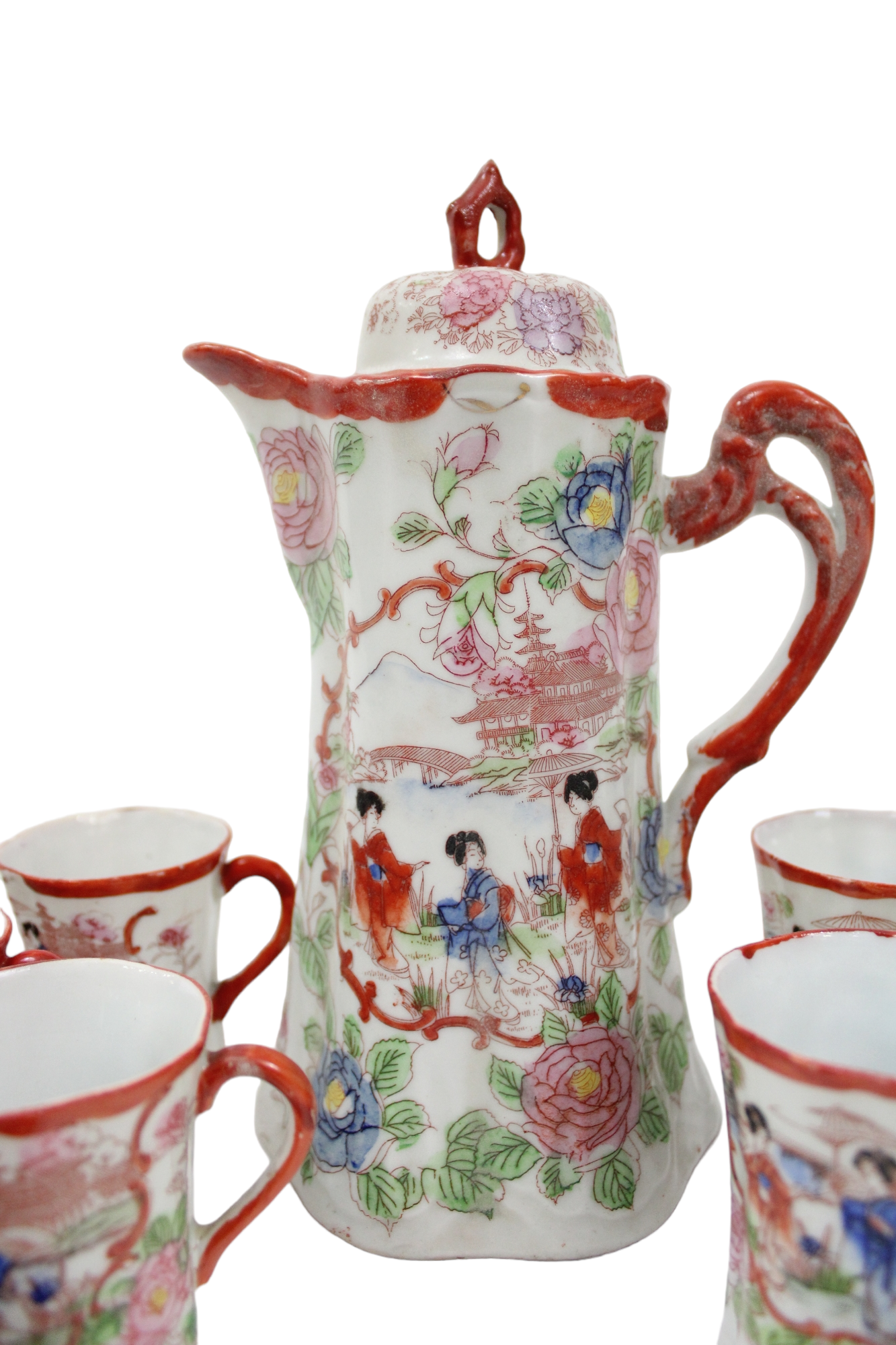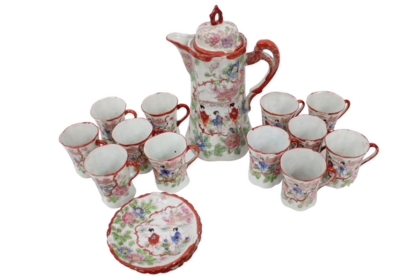 Vintage Red Painted Japanese Tea Cocoa Pot Set | Set Of 16